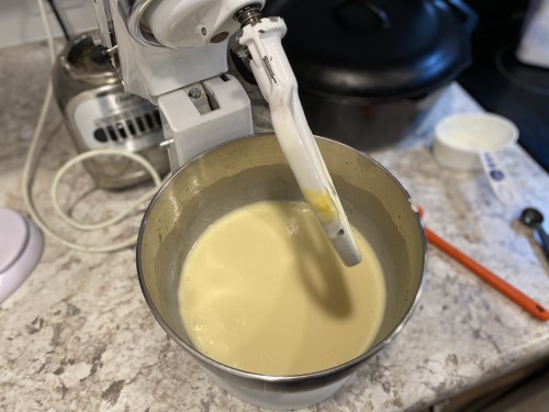 - Slowly pour in milk and mix, then stir in chocolate chips by hand.