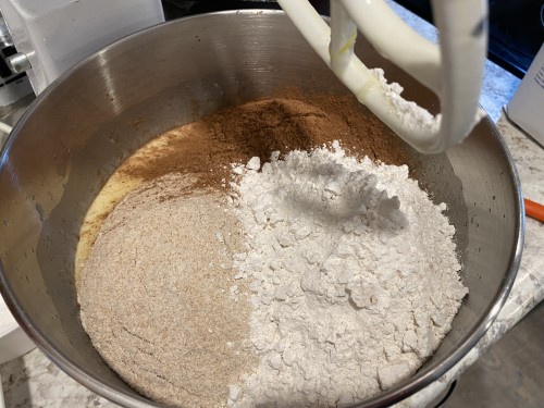 Now it’s time for the dry ingredients. Have you ever measured your flour? I find it makes a much more accurate measurement. I have a cheap and simple kitchen scale that I’ve had for years. One cup of flour weighs 120 grams. I used a combination of white flour and whole wheat, so I measured 240 grams of each to get 4 cups.