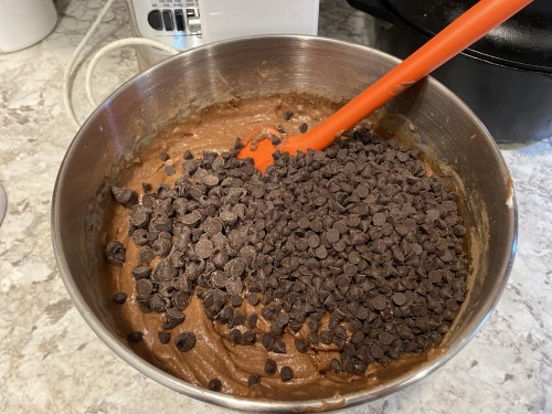 Once all of that is blended, slowly pour in the milk and mix, then stir in chocolate chips by hand.