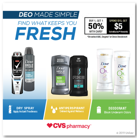 - $5 ECB wyb $15 Dove, Degree, or Axe Deodorant, B1G1 50% off, limit 1