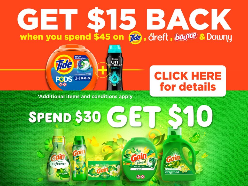 Spend $45 on Tide & Downy and get back a $15 prepaid gift card.