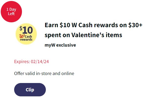 Did you wait til the last minute for Valentine’s Day? Head over to Walgreens to earn $10 Walgreens Cash when you spend $30 on Valentine’s Day items!