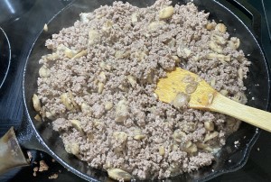 - In a large skillet, brown the ground beef. While it’s browning, chop or slice the mushrooms. Once the meat is done, drain any excess grease, remove from the pan and set aside.