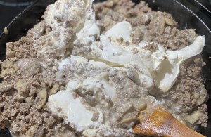 - Melt the butter in the same skillet and saute the mushrooms on medium heat until soft. Drain excess liquid if any. Add the beef back to the vegetables. Add Worcestershire sauce and stir to combine. Reduce heat to medium-low, then add the cream cheese and stir continually until it is thoroughly melted.