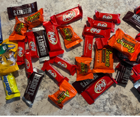 I started by raiding all the candy that my kids have gotten recently. I avoided hard candies or anything gummy, because I wasn’t sure how those would do when baked. Thankfully, there were lots of chocolate options!