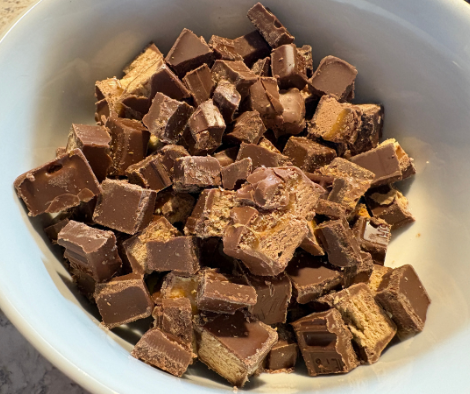 Mix together those, then add in the candy bars. I also threw in some M&Ms!