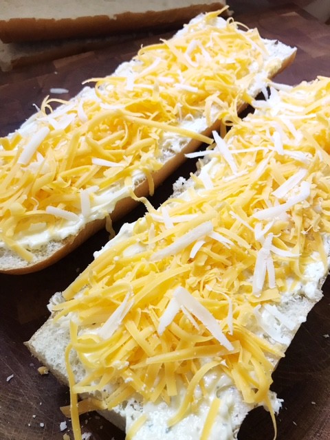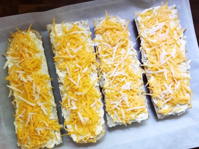 - Spread the butter mixture evenly over the bread and then top each piece with shredded cheese.