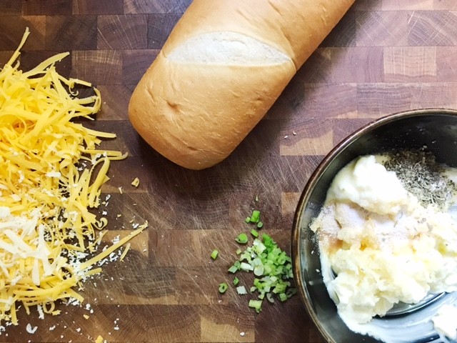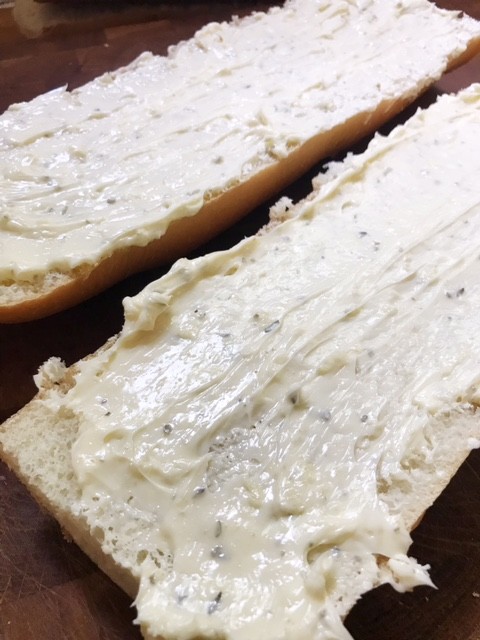 Note: The French bread I bought was huge! This recipe will be accounting for a large piece, which I cut in half and then sliced in half again, ending up with 4 pieces. You can adjust the amount of butter, cheese, etc. based on the size of your bread. Honestly, you can’t really go wrong with the amounts. Use your heart to determine how much butter and cheese should go on your bread.