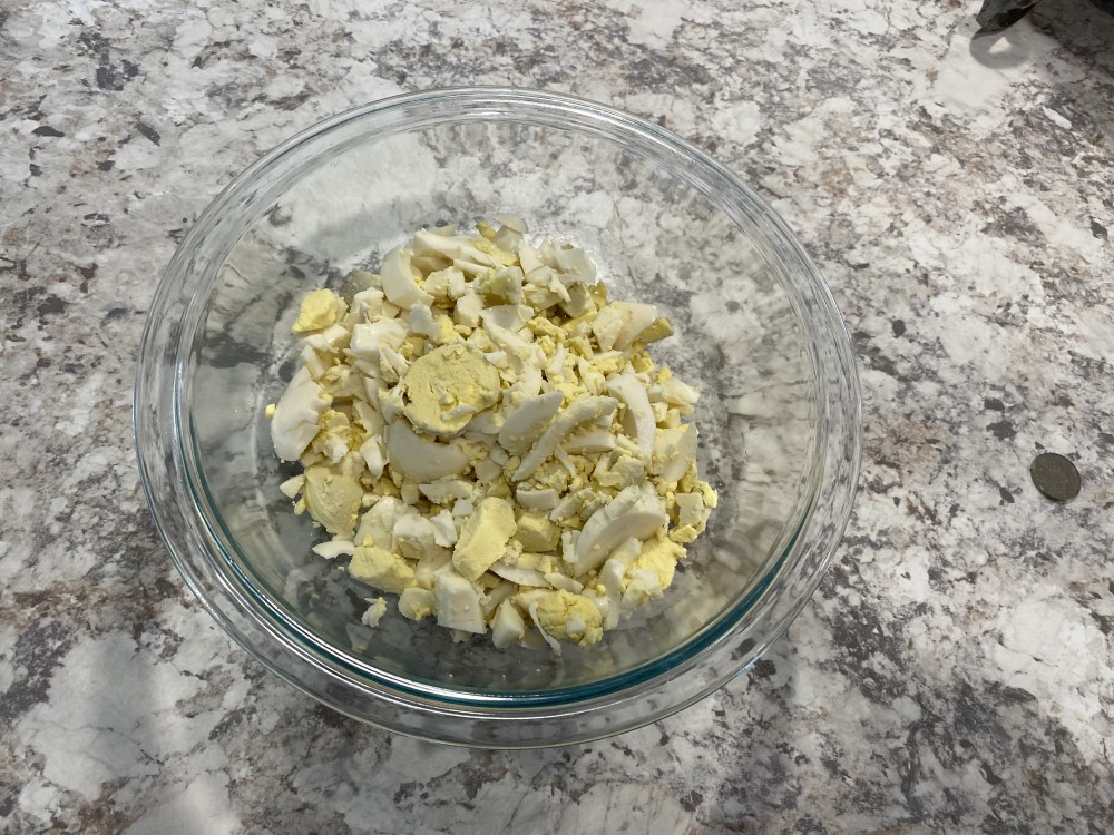 The first step is to peel and chop your eggs. If your peeled eggs don’t look great, that’s fine, because you’re going to chop them up. Egg salad is also great for eggs that crack while you’re boiling them. I don’t like to put eggs like that into the fridge without doing something with them, so choose those for egg salad first.