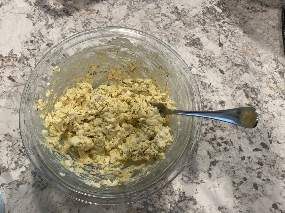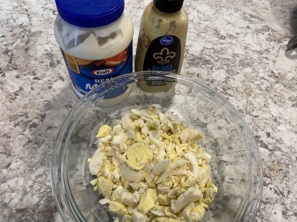 - Mix the mayonnaise and dijon mustard into the chopped eggs (add more mayo if you like it creamier!).