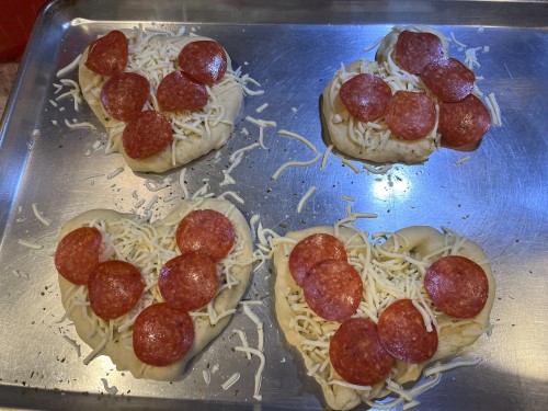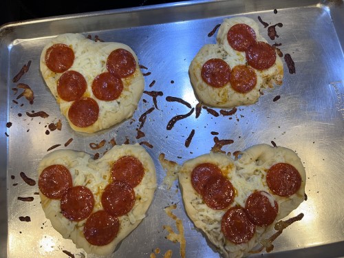 Poke the pizza with a fork to help prevent huge air bubbles and place in the oven for about 5 minutes to pre-bake. Notice that some of my hearts looked better than others!