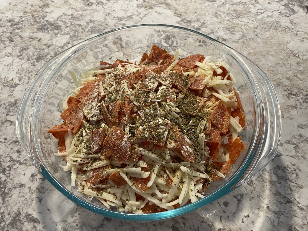 Prepare the “toppings” by dicing the pepperoni slices into quarters and mixing in a bowl with the shredded mozzarella, Italian seasoning, 1/2 tsp. salt, 2 tbsp. flour, and 1/2 cup parmesan cheese. Use your hands to mix this up and make sure the pepperoni slices are distributed evenly.
