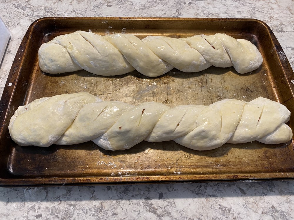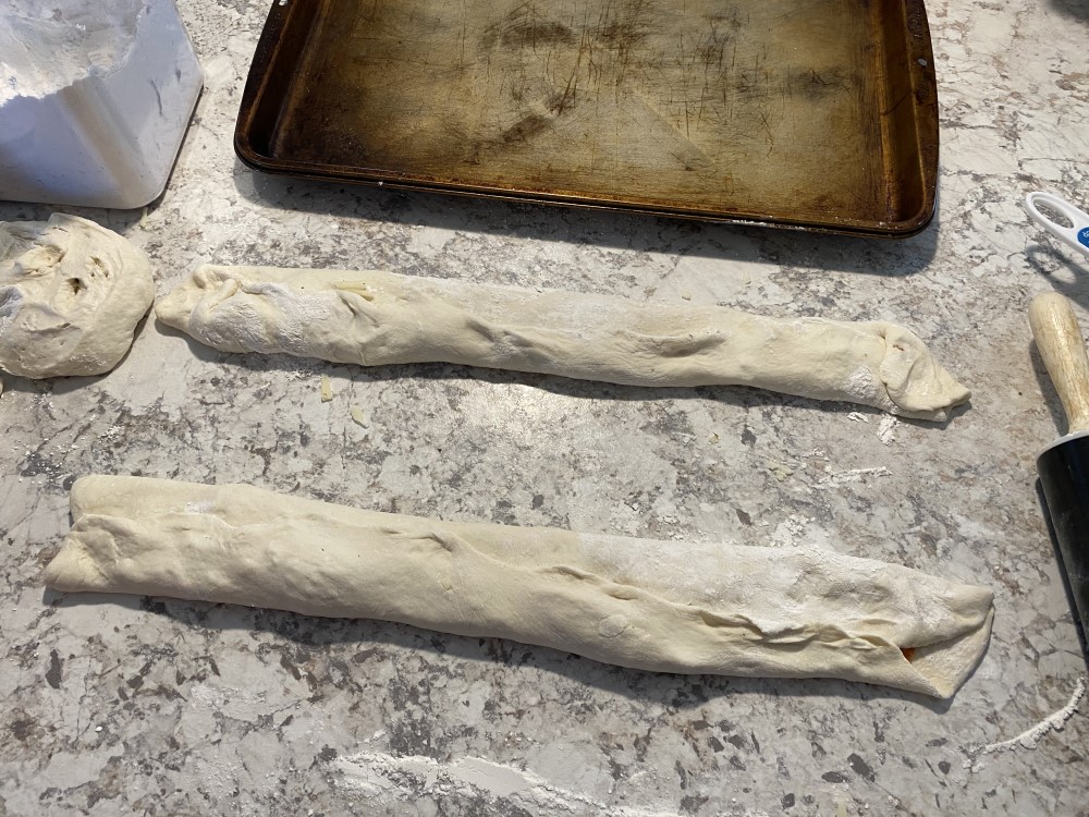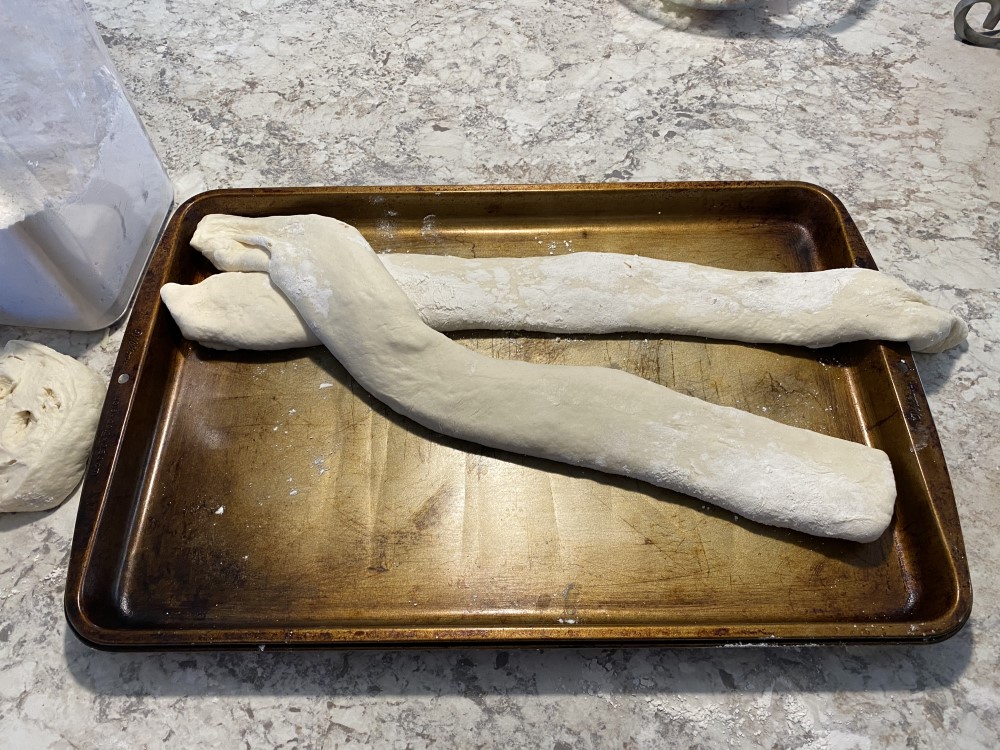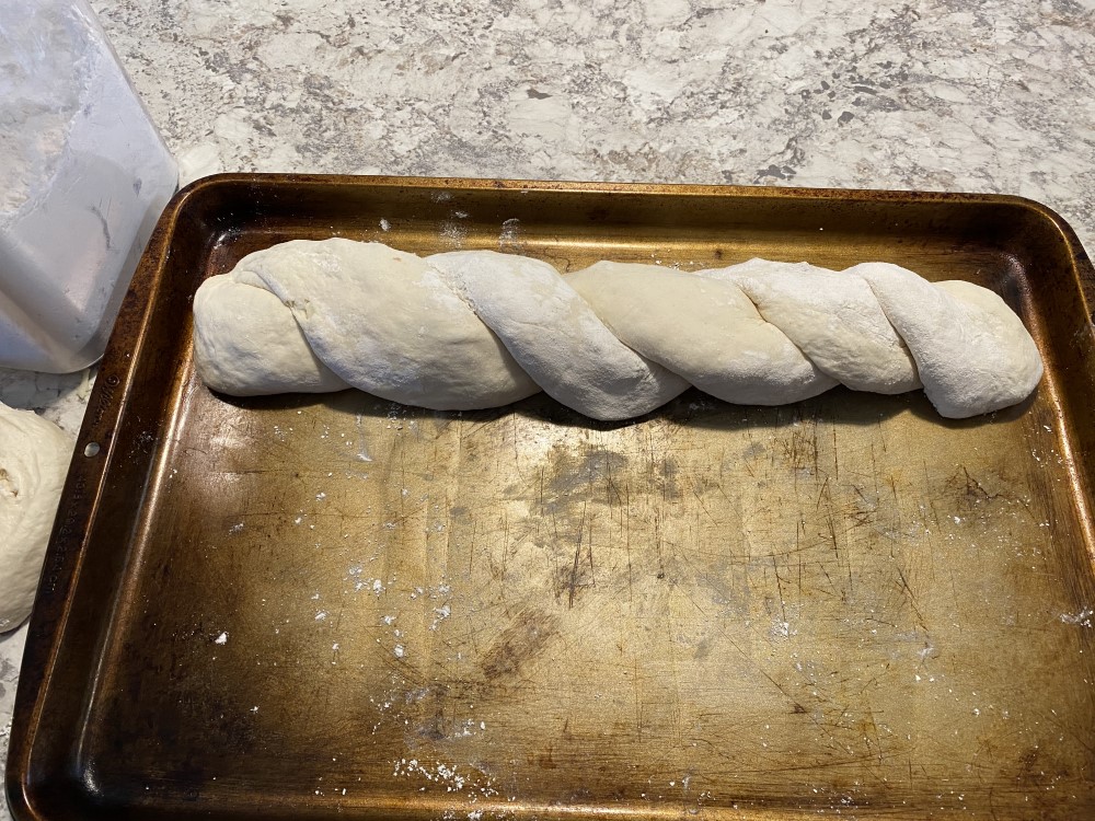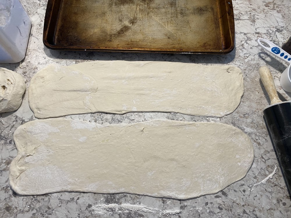 Roll each piece out into a similarly sized long rectangle. I use the baking sheet I’m using as a guide. It’s OK if your rectangles are a little longer than the pan; you’re going to weave them together and that will make the overall loaf shorter.