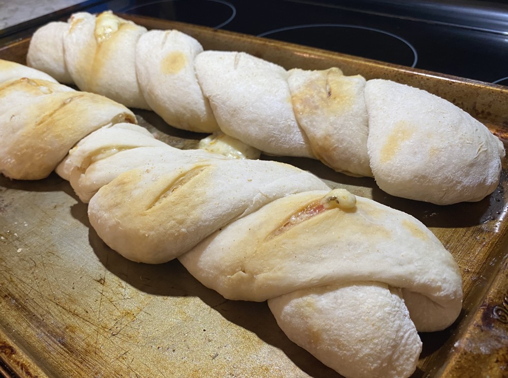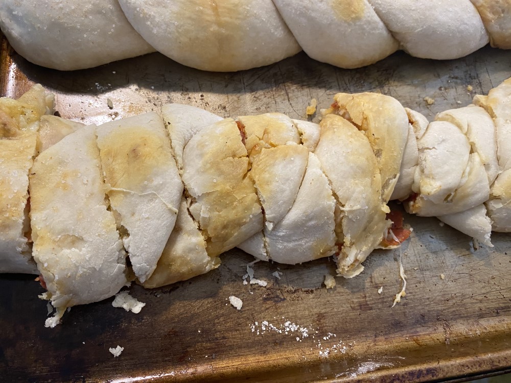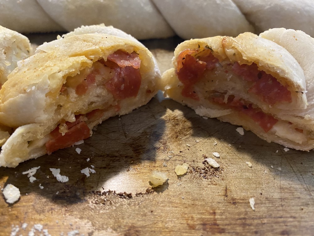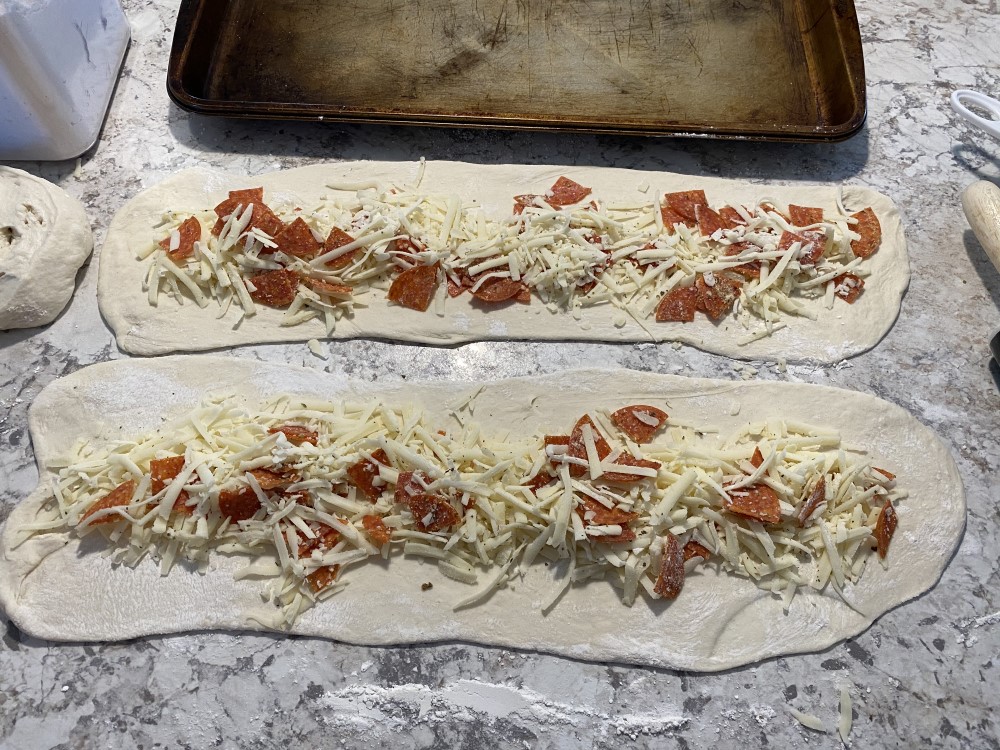 My version uses just chees and pepperoni, but anything that’s good on pizza would be good filling for this pizza bread! Just make sure you remove as much moisture as possible.