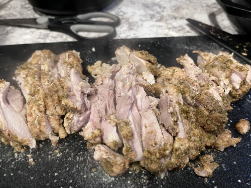 I like to do a little extra work and slice up the chicken and place it under the broiler for a few minutes.