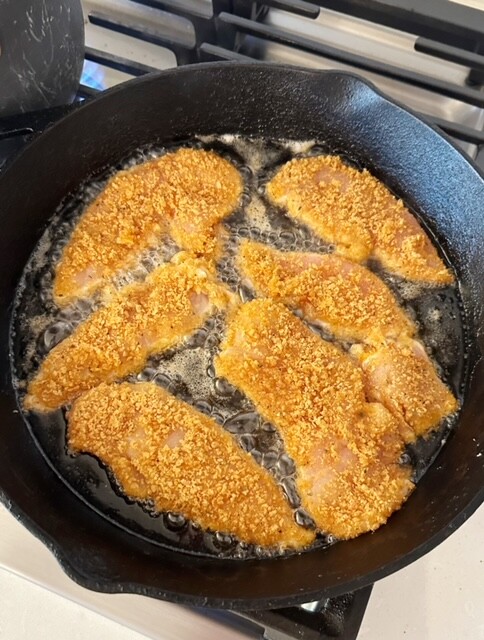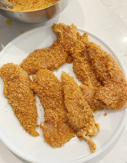 You’ll use pork rinds as the breading instead of the traditional white flour mixture.