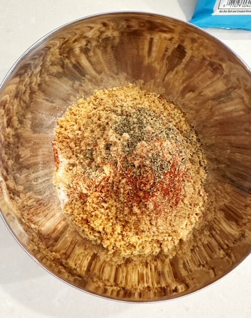 - In a wide, shallow dish, stir together the pork rind crumbs and the salt and pepper, basil, thyme, oregano, garlic powder, and paprika.