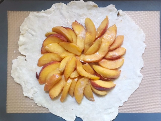- Arrange the peach slices in the center of the pie crust in a circle (you can even just scoop the peaches into the center; arrange however you like!).