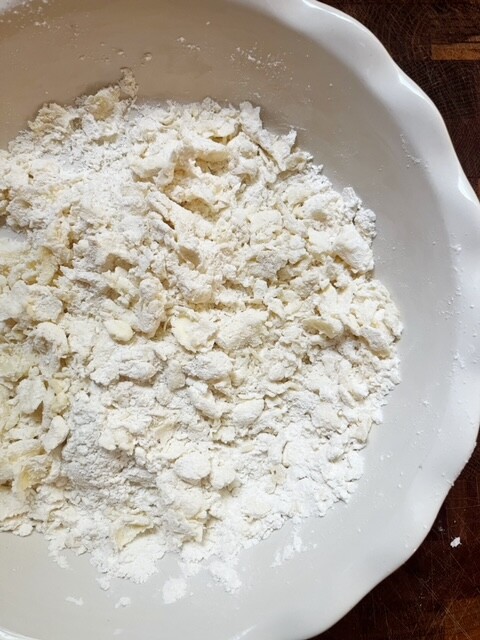 - Add the butter and, using your hands or a pastry cutter, rub the ingredients together until the mixture resembles small peas.