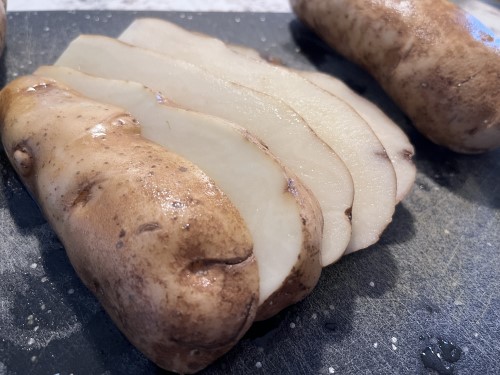 - Rinse the potatoes and cut them lengthwise into slices.