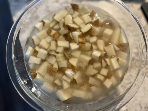 You’ll want to prep these earlier in the day, if possible. The best way to make these end up crispy is to let them soak in a bowl of water after you cut them up.