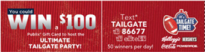 50 winners per day get a $100 Publix Gift card. Text TAILGATE to 86677. Enter Daily. Ends 10/9.