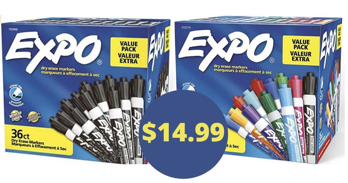 Head to Amazon where you can get 36 count EXPO Low-Odor Dry Erase Markers, Chisel Tip on sale for $14.99. Choose from a box of assorted colors or black whiteboard markers.