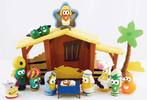 The nativity set includes a manger and 10 Veggie Tale characters and sings “Oh, Little Town of Bethlehem”.