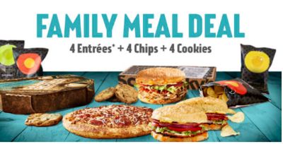 Probably the most flexible meal deal option is at Schlotzsky’s. Get something for everyone with your choice of 4 entrées, 4 chips and 4 cookies for $24.99. Entrée includes medium sandwich, pizza or flatbread. Need more than 4, add on as needed. Plus get free delivery on any order over $15.