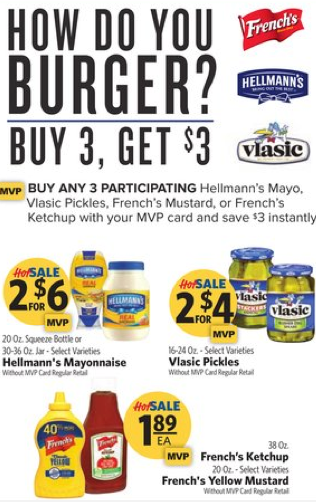 -$1 off Best Foods combo – buy (1) Best Foods Mayonnaise squeeze 20 oz, (1) Vlasic pickles and (1) French’s mustard 20 oz, SS 05/08