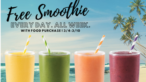 Get a FREE 24 oz smoothie at Tropical Smoothie Cafe every day thru 3/10 when you make a food purchase! Excluded food items are sweets, snacks, sides, and kid’s items. You must be a member for this freebie to apply.