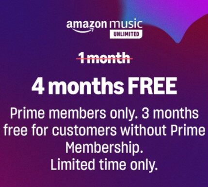 Prime members can score 4 months of Amazon Music Unlimited for FREE!! Non-members can get 3 free months. Offer is for customers who have never taken advantage of a trial offer before.