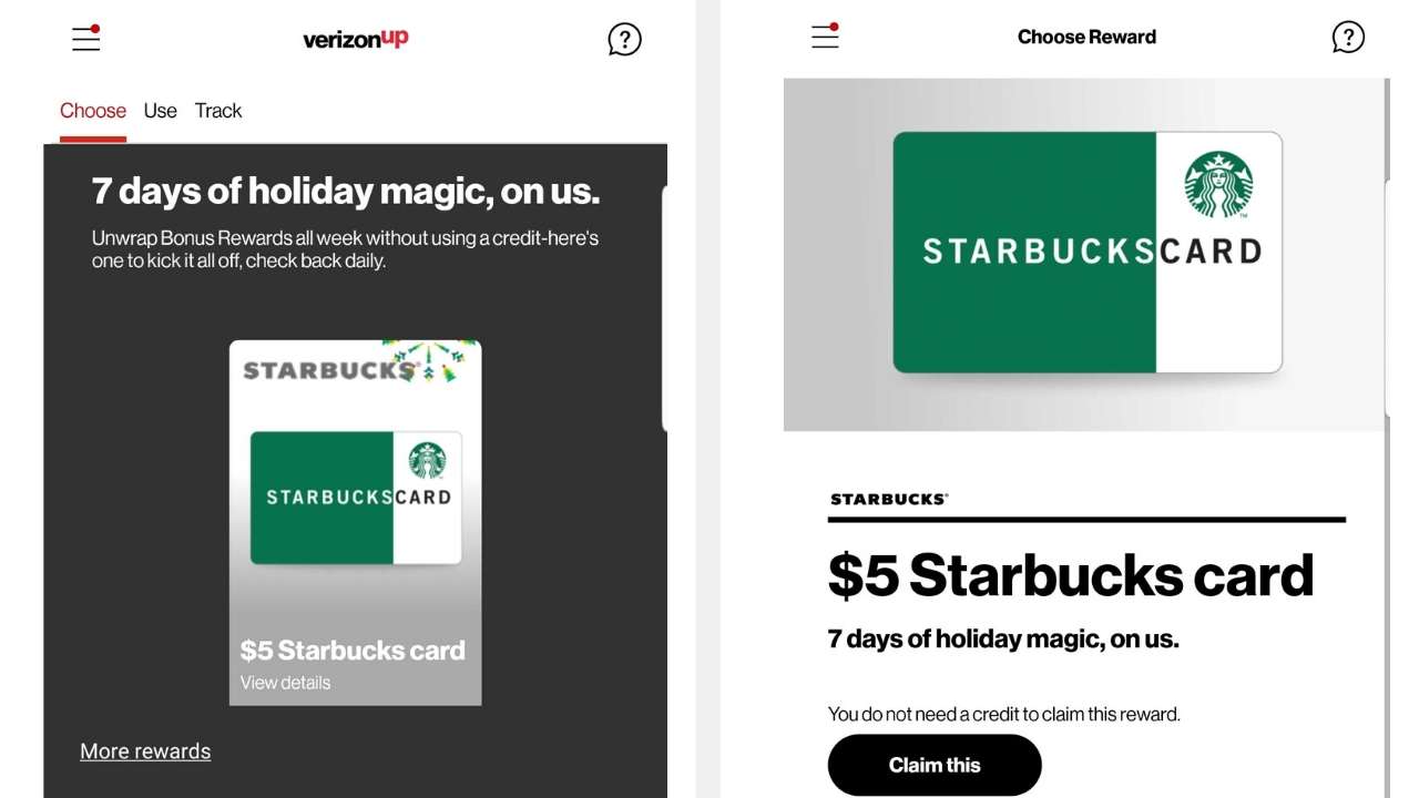 If you have Verizon phone or home internet service login to your Verizon UP Rewards account today and you’ll find a FREE offer for a $5 Starbucks gift card! There are no rewards needed, just claim the offer and it’s yours.