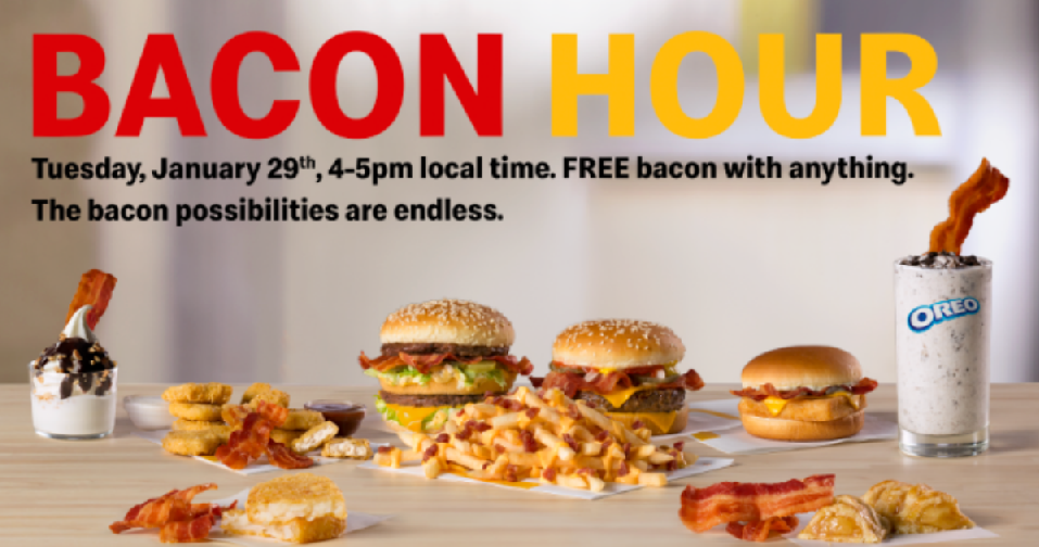 Are you a fan of bacon? Mark your calendars to head to McDonald’s on 1/29 from 4pm-5pm to get free bacon!