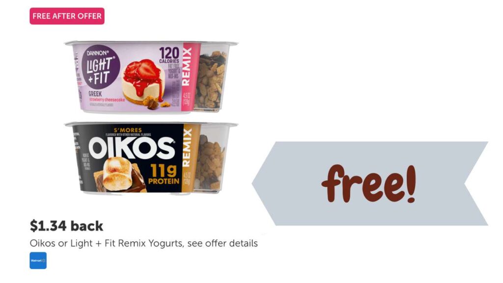 Load a new rebate on your Ibotta app and get a FREE Oikos or Light + Fit Remix Yogurt at Walmart right now!