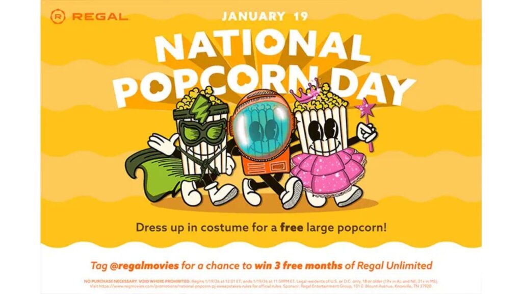 Even better, tag @RegalMovies in a social media post while in your costume on Popcorn Day for a chance to win 3 FREE months of Regal Unlimited. Ten (10) winners will be selected starting at 10 AM ET on January 20, 2026. Full sweepstakes rules here.