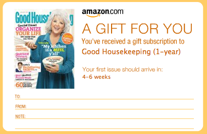 Good Housekeeping on RecyclebankOne tip if you want to give the magazine as a last minute stocking stuffer:  Head to Amazon and search for the magazine you get with the Recyclebank points. Look for the line that says “Giving a gift?” and easily print a gift notification card like the one above to let your recipient know to expect their first issue.  (They say Amazon on them, but the gift recipient doesn’t have to know it didn’t cost you anything!)
