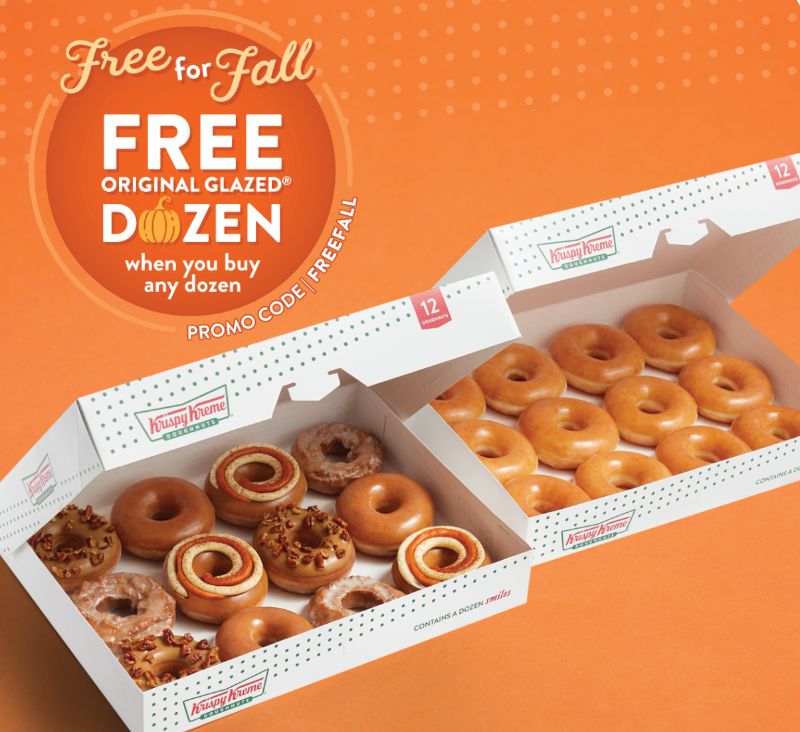 When you order any dozen doughnuts (including their new Pumpkin Spice Fall Collection) you’ll get a free dozen of Original Glazed doughnuts.