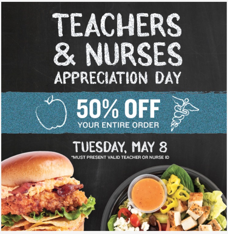 Tuesday, May 8th at all PDQ locations, teachers and nurses get 50% off your entire order with a valid ID all day long.