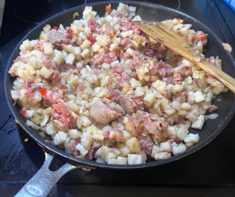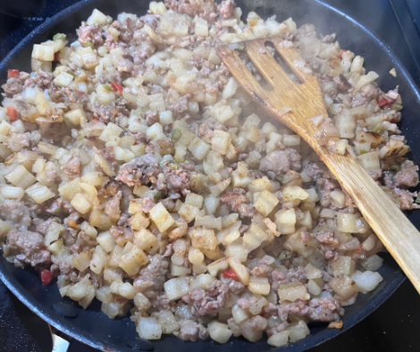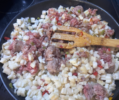Once the potatoes and sausage are all cooked, remove them from the heat.