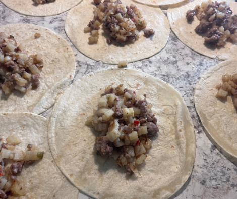 Lay your tortillas on the counter and divide the sausage potato mixture between tehem.