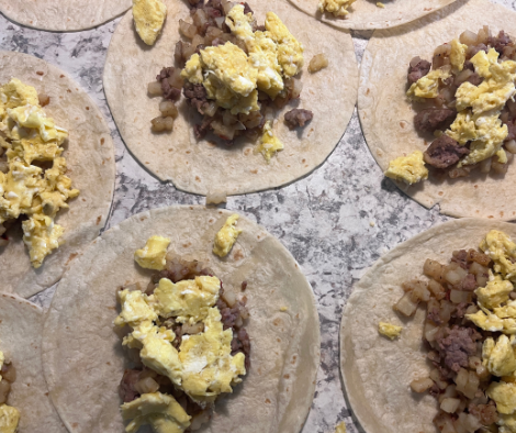 - Lay 12 tortillas out on the counter and divide the sausage potato mixture evenly on each tortilla.