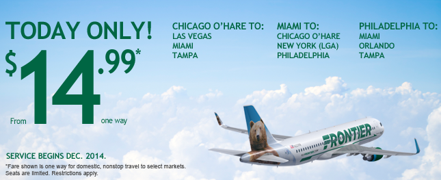 Today Only, get one-way Frontier Airline ticket for only $14.99! Yes, $14.99! This amazing deal is for the opening of their new hubs in Miami, Philadelphia and Chicago Starting 12/30.