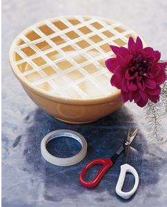 If you’re on Pinterest you might have seen some ideas where you can either use floral tape or Scotch tape to make a grid to hold your flowers in just about any container. Martha Stewart says to put 1-2 flowers in each square and fill in with the greenery pieces at the end.
