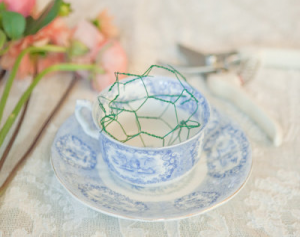 Form a dome-shape inside a teacup using chicken wire and use it as a mold for small stems. You’ll find chicken wire at the hardware store and use tape or floral tape to hold it in place.