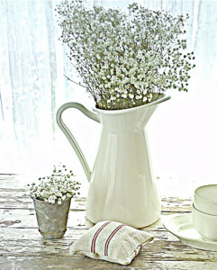 I like to buy bundles of it when it’s in season, dry it, and leave it in the vases during the Winter. This keeps me from going out and buying flowers that I love when they’re not in season. I also really enjoy the look of just a little stem of baby’s breath in a small, delicate container on my night stand. It looks so dainty and pretty.
