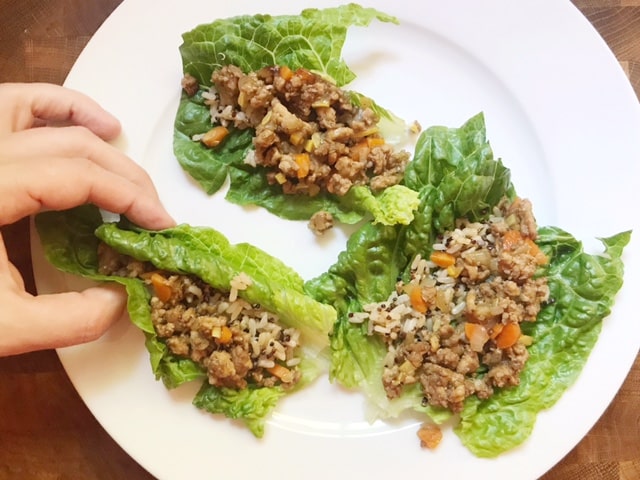 - To serve, add a spoonful of grains to the lettuce leaves and then a spoonful of the chicken mixture. Eat like a taco!