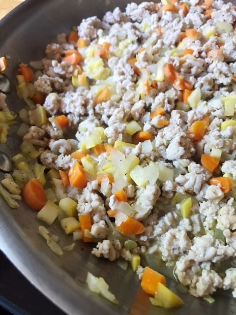 - Let the veggies cook for a few minutes until slightly soft (about 5 minutes) and add in the ground chicken. Season with a pinch of salt (not too much since the soy sauce will be pretty salty) and pepper. Crumble the chicken while it's cooking and cook until browned.