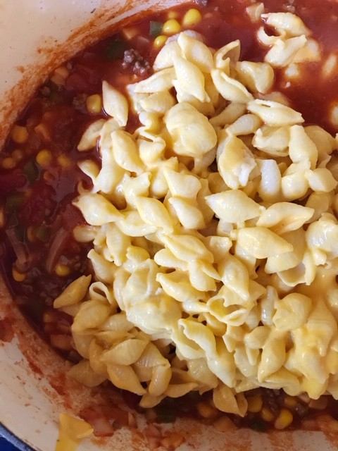 - While the beef mixture is simmering, cook the shells & cheese according to the package directions.