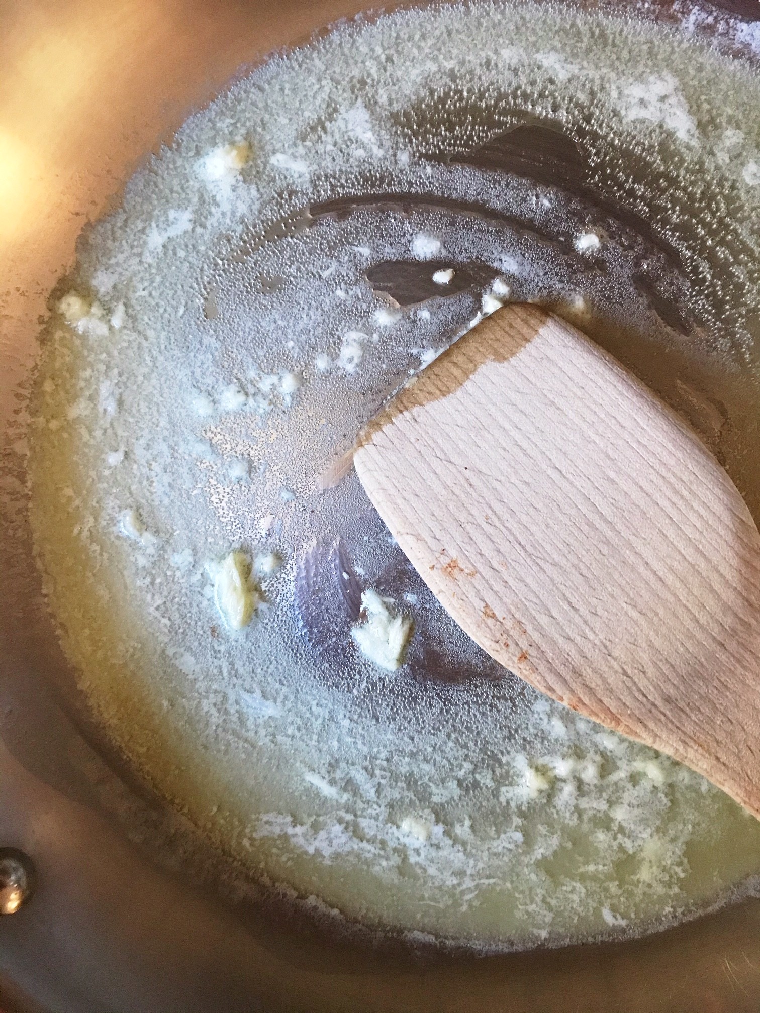 - In a skillet over medium-low heat, add the butter and allow to melt. Stir the garlic in and cook until fragrant (about 1 minute).